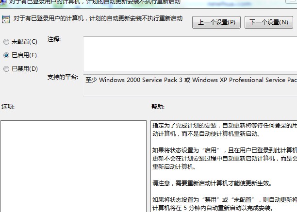 在右边的选项中双击“对于已登录的用户,计划的自动更新安装不执行重新启动”选项,在属性窗口内设置,默认为“未配置”,这里我们需要选择下方的“已启用”。