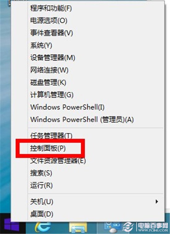 1.找到win8.1左下角的开始菜单,然后右击选择控制面板选项。