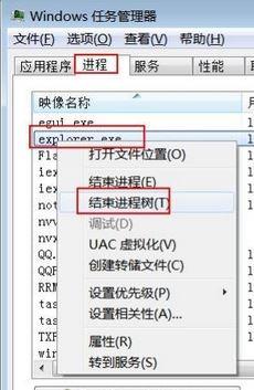 2、切换到“进程”选项卡,找到“explorer.exe”,右键选择“结束进程树”;