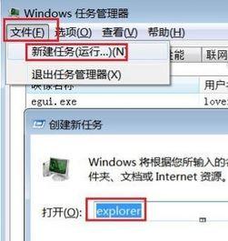 3、之后再点击“文件--新建任务(运行...)”,输入“explorer.exe”按下回车键,然后再清空回收站试试。
