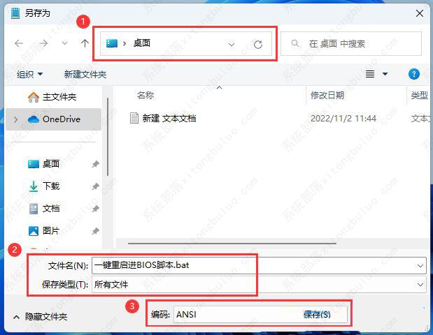 4、另存为窗口,注意三个地方:1)文件另存为的路径2)文件名填入以【.bat】结尾的名称,保存类型选择【所有文件】3)编码选择【ANSI】最后点击【保存】。