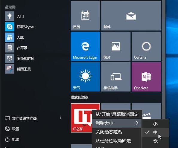 调整动态磁贴尺寸的方法为:右键单击动态磁贴—》调整大小—》选择合适的大小即可。