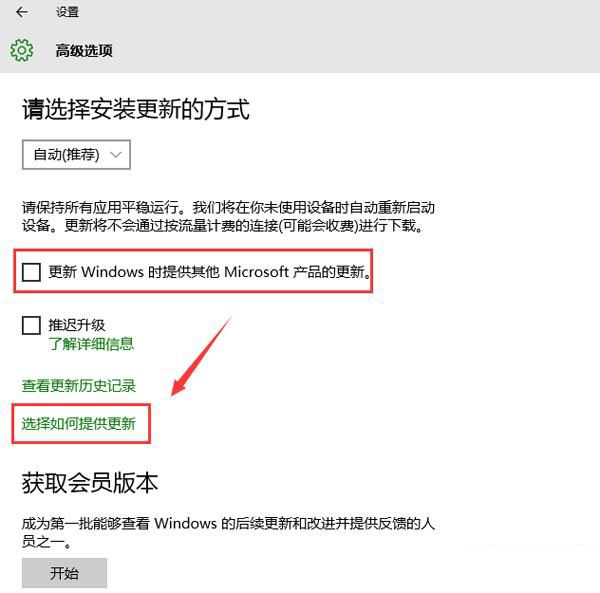 3、接着先取消勾选“更新windows时提供其他microsoft产品的更新”,再点击“选择如何提供更新”,如图所示: