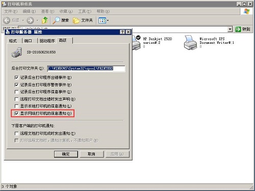 4、这时弹出“打印服务器 属性”窗口,选择“高级”,取消勾选“显示网络打印机的信息通知(o)”,然后点击确定。