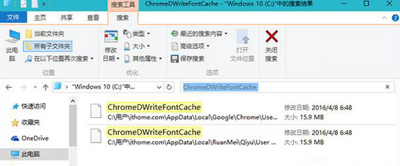 打开资源管理器—此电脑,在搜索框中输入ChromeDWriteFontCache,如下图所示,将所有搜索到的项目删除,重新打开浏览器时会自动重建这些缓存文件,此时即可恢复正常。