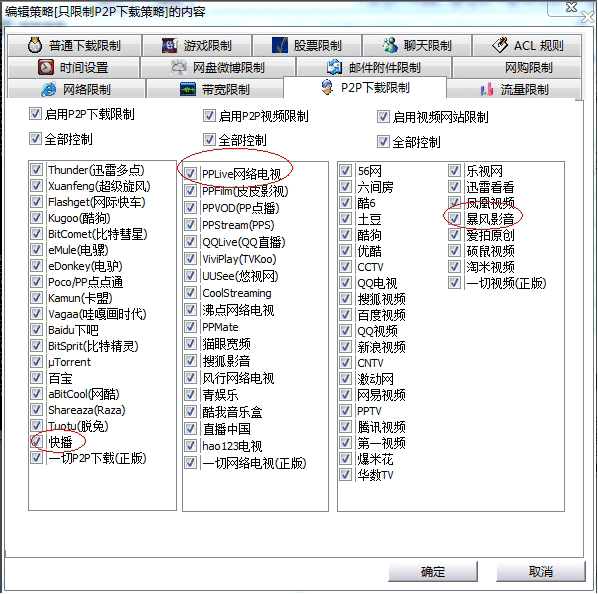 图:禁止P2P软件下载、屏蔽视频网站、禁止网络电视播放软件