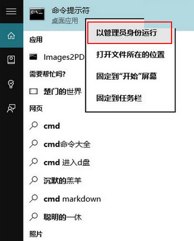①在Cortana搜索栏输入CMD,然后在第一个结果点击右键,选择“以管理员身份运行”