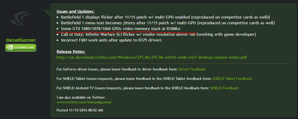 目前,NV客服已经承认上述问题,《战地1》和《使命召唤13》在一些特殊情况还会有BUG,只能等待下一版驱动修复了。