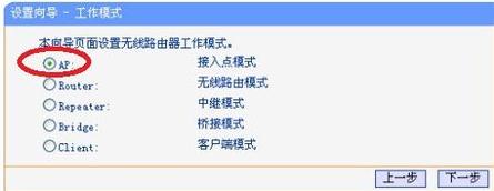 单击下一步,进入图中所示的无线工作模式选择页面,选择AP模式,然后点击下一步。