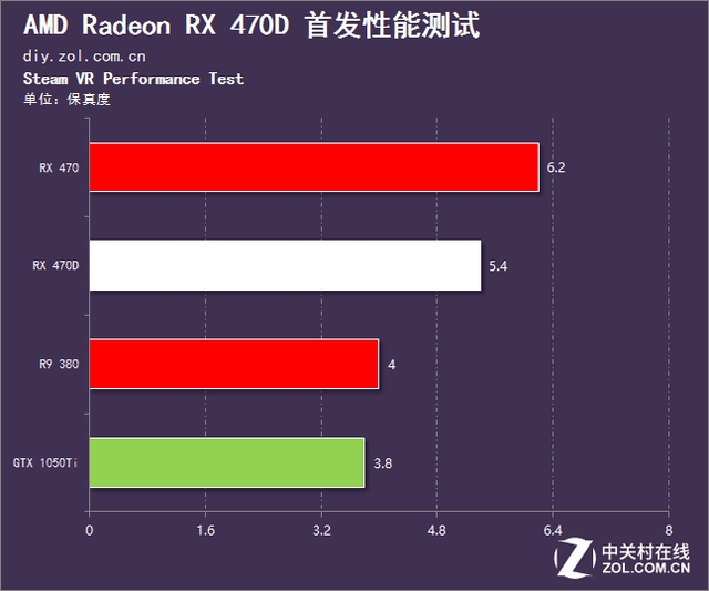 用Steam VR测试工具,RX 470D可以跑出5.4分,比GTX 1050Ti整整高出1.6分,可以流畅运行一些基础的VR应用,虽然未能达到VR Ready的需求,但VR性能还是可以的。