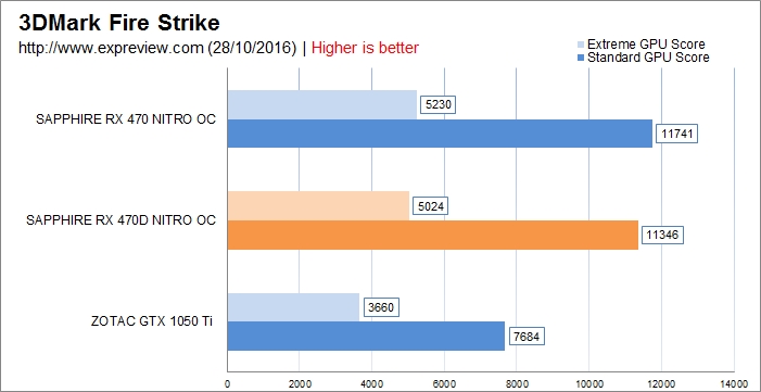 FS测试专攻DX11,TimeSpy专攻DX12,前一项领先1050 Ti约(E模式)37%,后一项,RX 470D要领先GTX 1050Ti约35%,而RX 470D落后RX 470约13%。