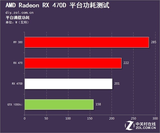 空载功耗方面,所有参测显卡所在平台的功耗均在70W以下。首先我们需要清楚的是R9 380、RX 470、RX 470D以及GTX 1050Ti的TDP分别为190W、120W、110W以及75W,因此从图中我们可以看出,R9 380的平台满载功耗最高,为285w,其余几张卡根据TDP情况依次递减,GTX 1050Ti最低,仅为158W。
