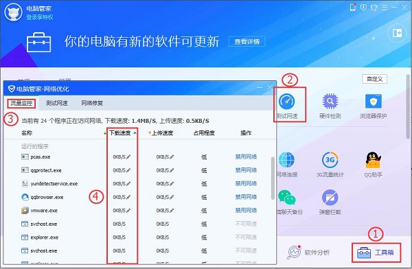 解决办法:下载一个百度卫士或者电脑管家,打开流量监控,或者网速管理。在这里我用腾讯的电脑管家给你演示,点“工具箱→测试网速→流量监控”,进行一个排序。然后当你出现网速特别慢的时候,看一下这里,是什么软件在占用你的网速。如果是不需要用到的软件,可以卸载,或者可以在后面那里进行限速。