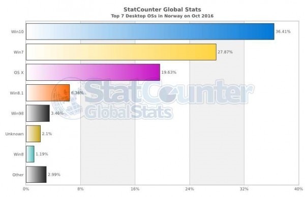 在丹麦,Windows 10市场份额跃居第一,高达42.42%,苹果的OS X位居第二,市场份额为23.15%,而Windows 7市场份额只有20.86%,屈居第三。同样在挪威,Windows 10和Windows 7以36.41%和27.87%的市场份额,分别位居排行榜第一和第二,OS X则以19.63%的市场份额位居第三。值得一提的是,在挪威市场Windows 98竟然还有3.46%的市场份额。