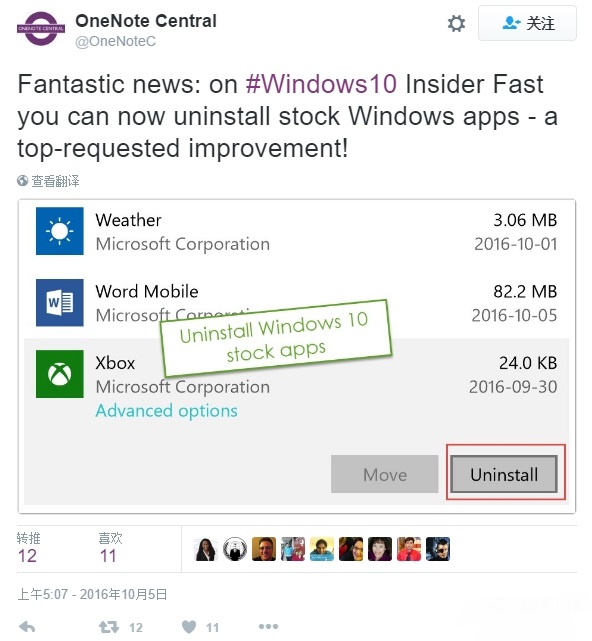 推特用户“OneNote Central”率先爆料,此版本的Windows 10可以卸载部分原生应用,现在winbeta也证实了这一说法。
