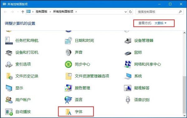 2、将“查看方式”修改为“大图标”,在下面点击“字体”;
