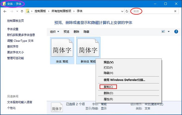 3、在右上角的搜索框中输入“宋体”,在下面会出现2-4个宋体文件,我们将搜索出来的文件上单击右键选择复制,复制到桌面,要注意的是,每个字体都要新建一个文件夹,分开放,否则会被覆盖;