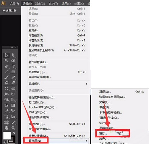 1、打开AI软件后,点击菜单栏中的编辑——首选项——增效工具和暂存盘;