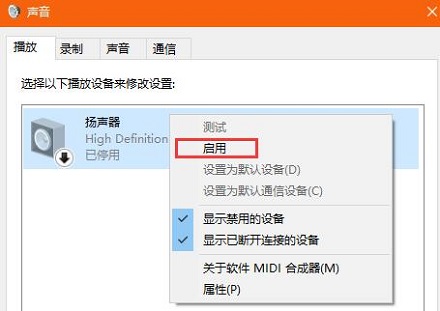 2、在“播放”选卡中将“扬声器”单击右键,点击“启用”即可。