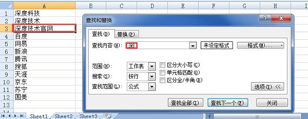 深度技术Win7系统在Excel 2007表格中搜索内容的方法
