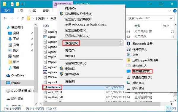 2、在该文件夹中找到“Write.exe”单击右键,选择“发送到”—“桌面快捷方式”,方便打开。