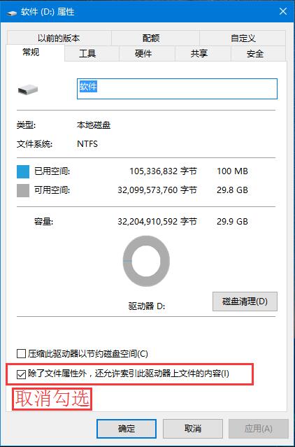 1、电脑中有一个设置是索引硬盘上的文件内容,这个功能会加大系统对硬盘的访问,增加负担,我们可以将其关闭:以D盘为例,打开磁盘属性,在常规选项卡中,可以看到下方有一个选项为“除了文件属性外,还允许索引此驱动器上文件的内容”,取消该选项的勾选,点击确定;