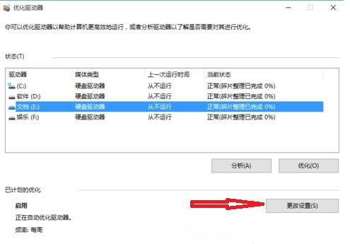 7、选择需要优化的磁盘,点击“更改设置”按钮;
