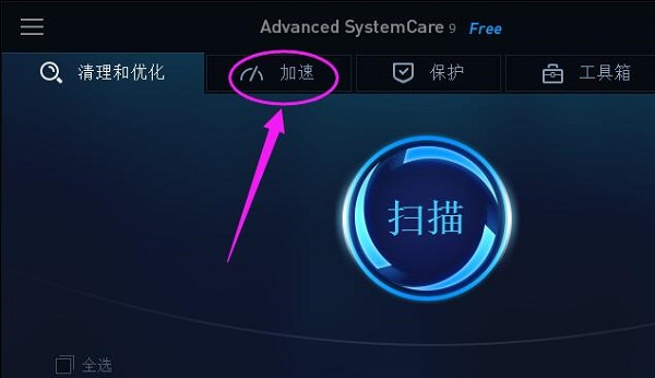 2、打开“Advanced SystemCare”,点击“加速”;