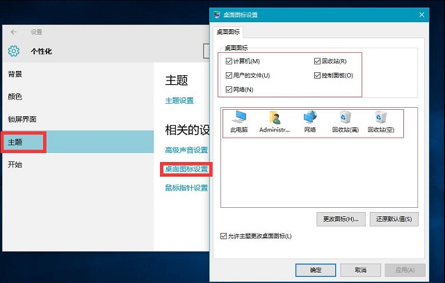 4、ms-settings:themes命令,可打开个性化-主题窗口,对刚安装Windows10系统的新朋友,把【此电脑】、【网络】、【用户的文件】等图标恢复到系统桌面要容易得多;
