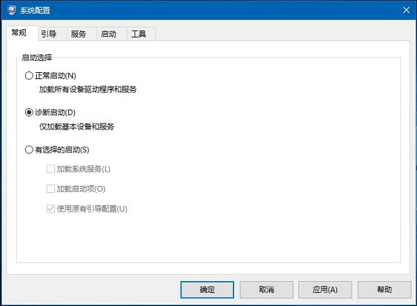 2、在“常规”选卡下点击“诊断启动”点击应用;