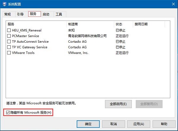 3、切换到“服务”选项卡,勾选“隐藏所有Microsoft 服务”,然后点击“全部禁用”点击应用并确定,在弹出的框中点击稍后重启;