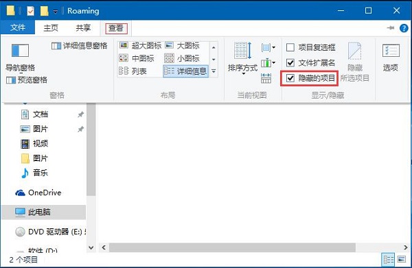 5、点击菜单栏上的“查看”,在右侧勾选“隐藏的项目”;