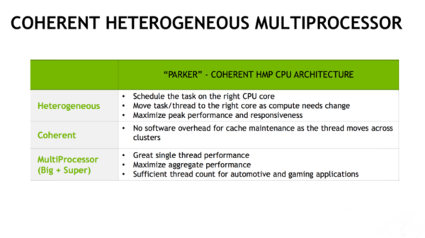 Tegra Parker设计为4核A57+2核丹佛2的六核心,ARM v8指令集,GPU部分是256个CUDA核心,也就是说和Tegra X1数量一致,但架构从二代麦克斯韦升级为帕斯卡。