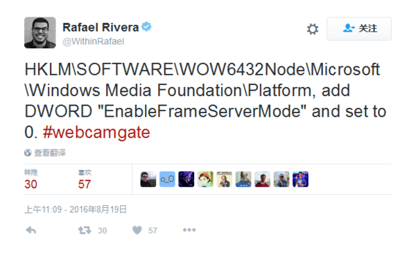 目前工程师Rafael Rivera已经在推文上提供了临时解决方案,在注册表HKLMSOFTWAREWOW6432NodeMicrosoftWindows Media FoundationPlatform路径下新建EnableFrameServerMode的键值,并设置为0,即可正常使用摄像头。