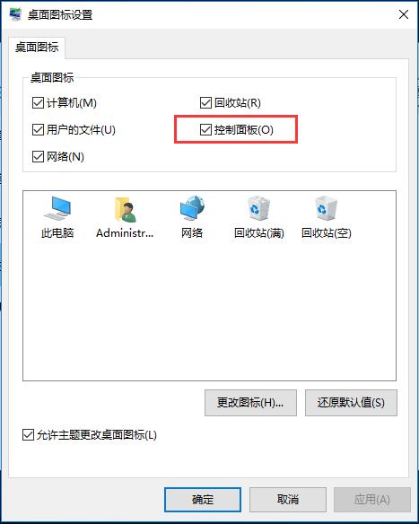 3、在桌面图标匡中勾选“控制面板”,点击应用并确定,我们就可以在桌面上快速打开控制面板了。
