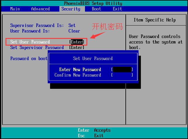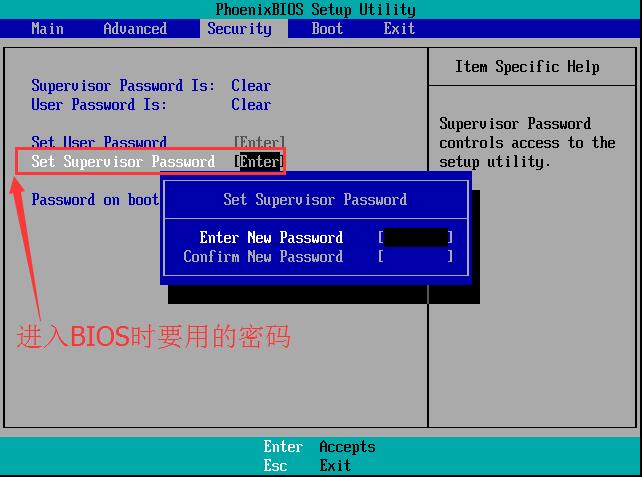 3、根据下边的提示按钮,使光标向右移动,进入到Security,如下图:先设置这个密码,这是进入BIOS的密码。设置完之后,就可以设置其他密码了;