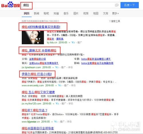 网页版百度搜索是我们最常使用的搜索引擎,推广广告也最多,咱们来试试。小编尝试输入“瘦脸”进行搜索,结果显示排在前六位的均为推广广告,随便点击某一链接则直接进入该美容医院官网,并弹出各种咨询提示显得极不正规。