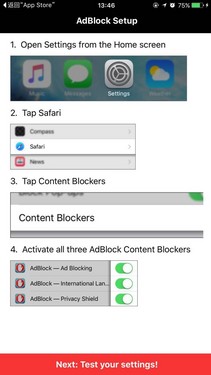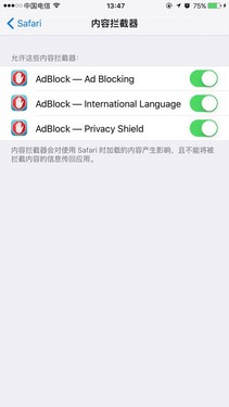 安装完毕后,应用会弹出使用指导,虽然是全英文显示但其实操作方法非常简单无需担心。首先进入设置-Safari-内容拦截器,将三个选项全部开启即可。