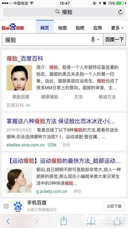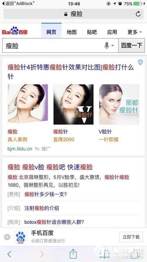 在手机上使用百度搜索同样有推广广告这个问题,小编打开了iPhone自带的Safari浏览器,在百度搜索页中输入关键字“瘦脸”,不出所料页面中的前几条结果均为广告。由于iOS系统的限制,无法直接在设置中进行屏蔽,只能借助其它软件的帮助,小编推荐:《AdBlock for Mobile》。