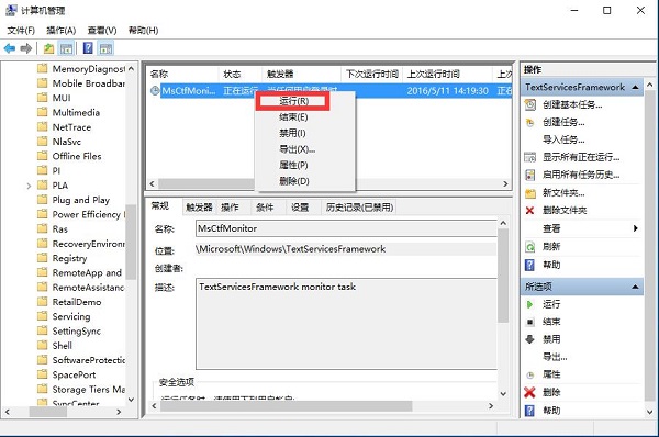 2、在计算机管理的系统工具——任务计划程序——任务计划程序库——Microsoft——Windows中找到TextServicesFramework,如下图所示,在右侧可以看到名为MsCtfMonitor的任务计划程序,右键单击MsCtfMonitor,选择“运行”即可。