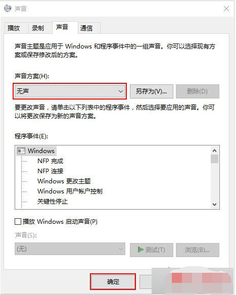 5、在展开的声音方案中选择“无声”,点击确定“按钮”即可,如下图所示: