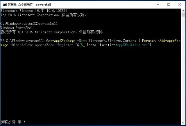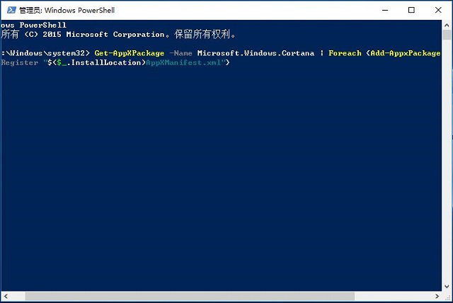 ▲图片说明:这一命令的作用是重新注册Cortana应用