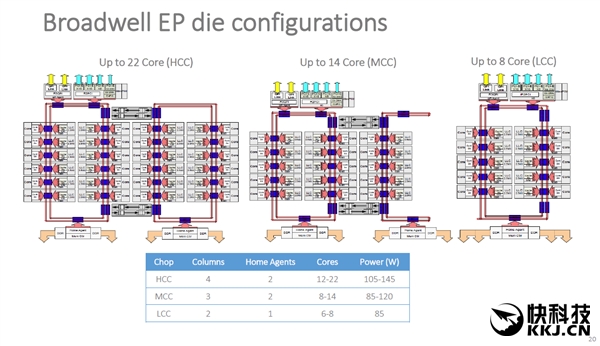 另外,Broadwell-EP家族有三种核心,分别有最多22个、14个、8个核心,i7-6950X自然是从第二种核心演变而来的(屏蔽了4个核心),其他三款则是由最小核心而来。