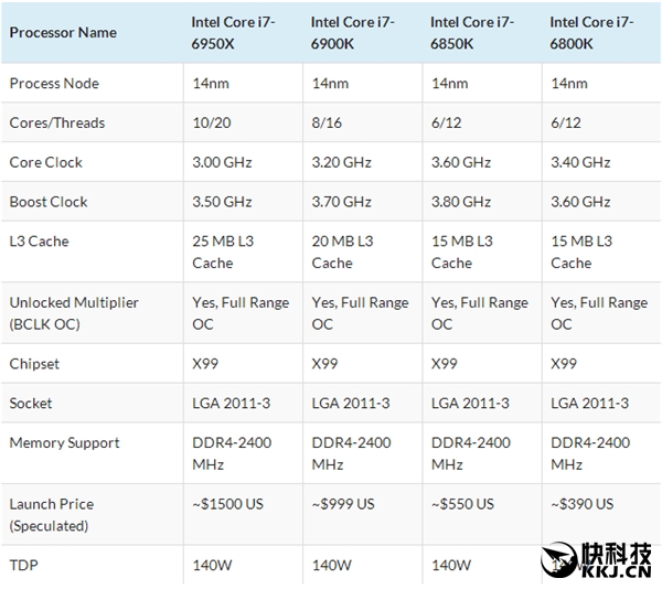同时发布的还会有八核心Core i7-6900K、六核心Core i7-6850K/6800K,都开放超频,热设计功耗都是140W。