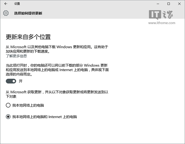 Win10更新下载来源可以很灵活,不仅是微软服务器本身,还可以像BT下载那样从多个源下载,这些源可能是你身边的电脑,也可以是网上的其他用户。在设置→更新和安全→Windows更新→高级选项→选择如何提供更新中,如果你想要让下载最快,那么需要打开与其他用户分享更新包的选项,好处在于你也可以从其他用户那里获得更新下载资源,缺点就是可能会占用你一部分带宽,但一般来说对日常使用没什么影响。之后可以选择你想要获取更新或者愿意分享你更新的范围,一个是你本地网络上的电脑,另一个是还包括其他所有网络上的电脑。系统部落之家建议,如果你使用个人网络环境,那么最好还是选择后面一项,公司用户可以选择第一项。