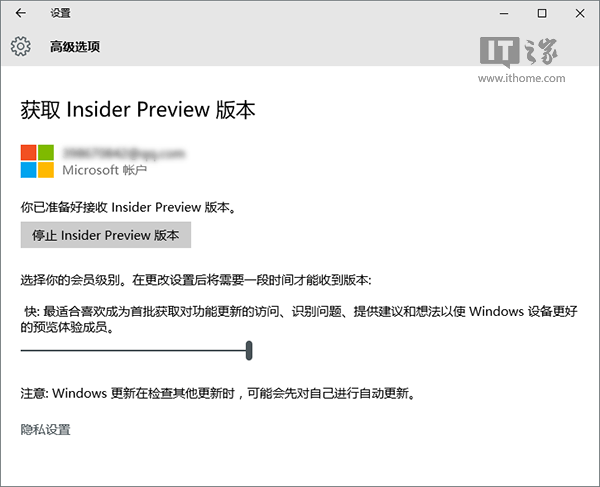已经安装Win10正式版的用户,可在设置→更新和安全→Windows更新→高级选项的下方开启该系列版本的接收,系统部落之家从微软处获知,首次开启24小时后,微软会向你推送预览版更新。这些版本共分为两类(如上图),一是“慢速版”,顾名思义该版本推送频率较低,各个方面都更加稳定;二是“快速版”,该版本推送频率较高,稳定性也相对较差,但能够保证在第一时间用到最新功能。