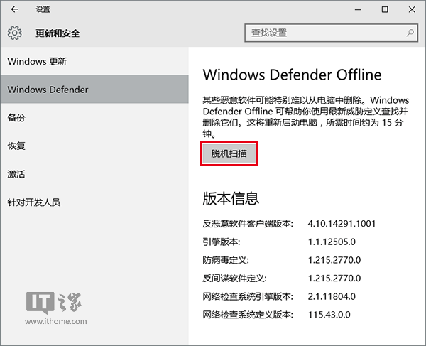 离线版杀软一般用于恶性病毒的查杀,常见于U盘等介质启动的形式。Windows Defender早就有离线杀毒模式,而Win10 RedStone(红石)正式版中该功能默认内置系统,进入设置→更新和安全→Windows Defender,在下面就可以看到Windows Defender Offline,点击“脱机扫描”后,系统将重启并且进入查杀模式,整个过程大约需要15分钟,结束后将重启至正常模式。