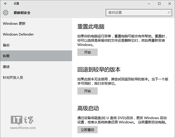 “重置”是Win8/Win8.1以来微软提供的一项较为便捷的方式,它的作用类似于重装系统,但步骤上要省事得多。在设置→更新和安全→恢复中,第一个选项就是“重置此电脑”,点击“开始”就可以进行(如下图)。如果你想彻底“一干二净”,可以在重置的过程中选择不保留个人文件;如果你还有重要文件,也可以选择保留,选好之后就开始重置系统的任务了。