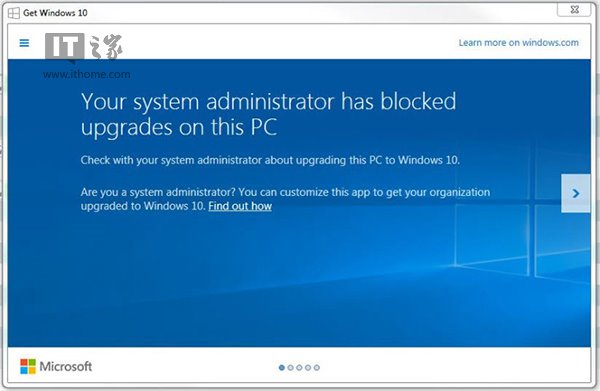 但现在看来这个补丁的作用还不止这一点。根据国外媒体报道,很多企业系统管理员反馈,在他们公司内部的电脑中也出现了如下图所示的Windows10升级提示。窗口内文字提示:“你的系统管理员已经在这台设备中禁用了升级.....”