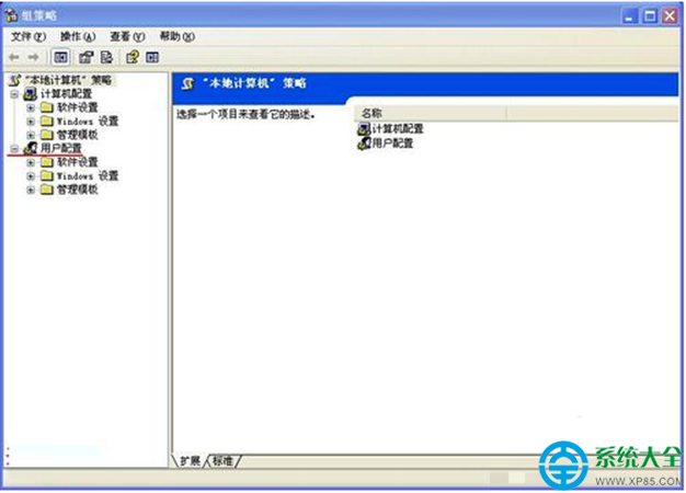 2、找到组策略中的用户配置,并点击用户配置前面的小“+”展开;